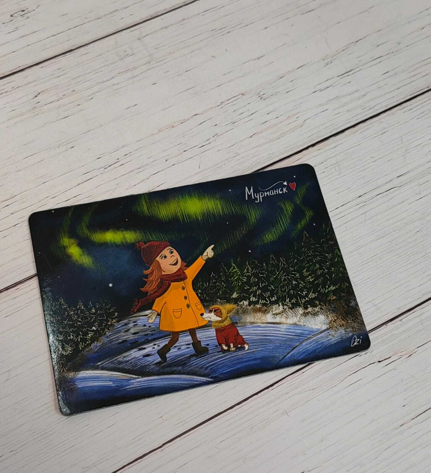 Магнит из винила с изображением авторских рисунков является уникальным сувениром, который сочетает в себе искусство и местную символику. Художник М. Окулич передает в своем произведении характерные черты Кольского полуострова, Севера и Арктики.